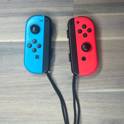 Säljer ett par Nintendo Switch Joy-Cons. En röd och en blå. Den ljus-blåa kontroller trycker neråt av sig självt. Den röda har stickdrift.