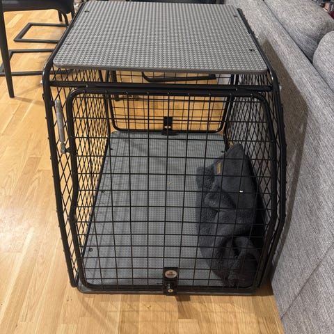 Hundbur tillverkad i aluminium. Burens konstruktion är stabil och lätt. Mellanvägen går enkelt att plocka bort om man vill ha en stor bur istället för två fack. Finns en nyckel till låset.