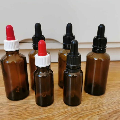Brun glasflaska med pipett, volym 30 ml. Flaskan är avsedd för förvaring av vätskor och har en pipett för dosering. Materialet är glas och färgen är brun.