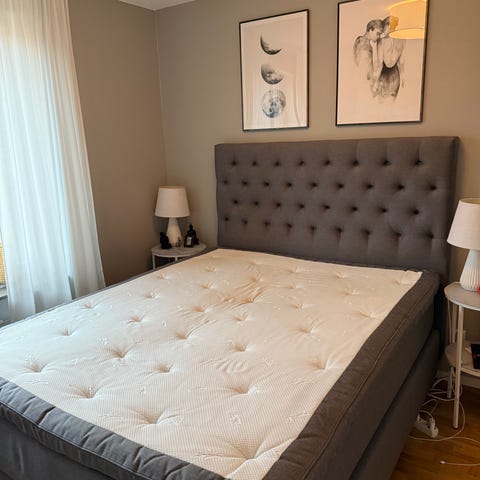 Säljer nu vår säng från sängfabriken med mörkgrå klädsel, 160x200cm. Inköpt augusti 2023, nypris 14 000kr.