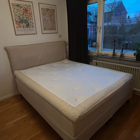 Finns en fläck på bäddmadrassen, se bild, inget som stört eftersom det är under både madrasskydd och lakanet.