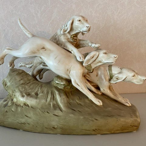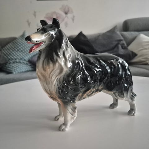 Två porslinshundar med vit grundfärg och blå detaljer på öron och blommönster. Varje hund är dekorerad med en halskedja i guld färg och har en sittande position. Passar som dekorativa föremål.