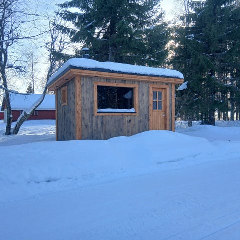 Träbyggnad i mindre storlek med röd målad fasad och vit dörr. Byggnaden är placerad utomhus och omgiven av snö. Passar för förvaring eller som liten bod.använd som utedass under byggprojekt.