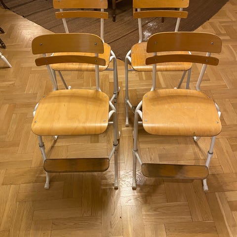Stapelbara skolstolar / industristolar – trä & metall – 3 st kvar
