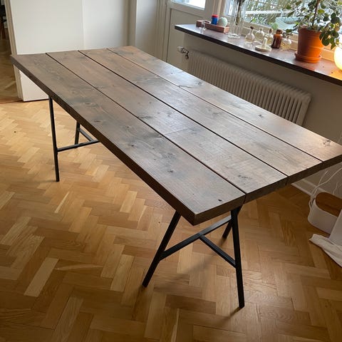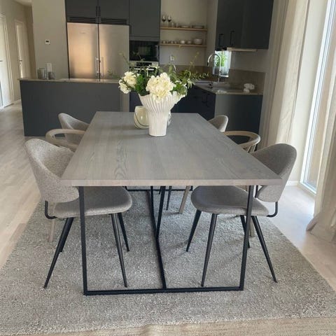 Säljer ett massivt matbord som blivit skadat i transport på ena hörnet. Vitoljad ek C6. Benen är ifrån ett annat matbord som heter Flex från samma danska tillverkare i gråoljad ask. Passar helt okej till.