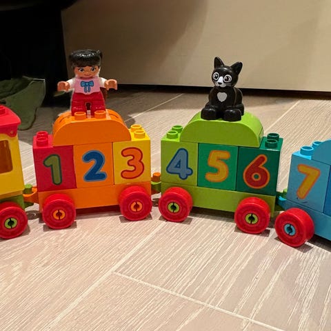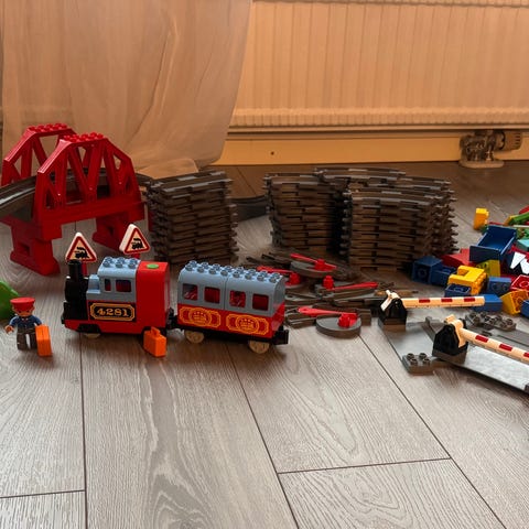 LEGO DUPLO tågbana med flera spårdelar och ett tåg i färgerna röd, gul, grön och blå. Setet består av plastmaterial och är anpassat för barn.