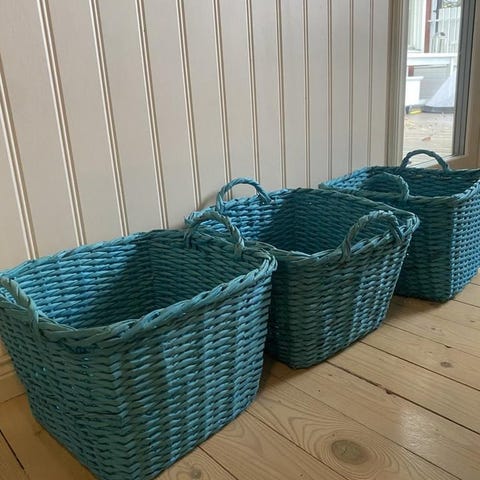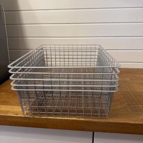 Kan användas till förvaring eller för barn att leka affär med. En av korgarna har en liten buckla och det saknas skruv till ett av handtagen.
