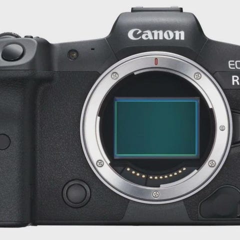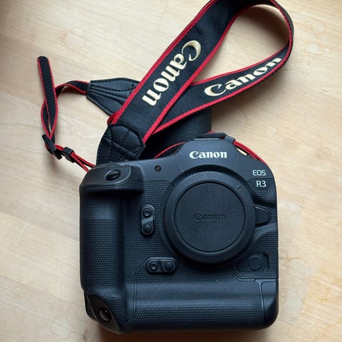 Canon EOS R5 digital systemkamera. Kameran är svart och tillverkad av Canon. Modellen är EOS R5 och är en digital systemkamera som passar för avancerad fotografering och videoinspelning.