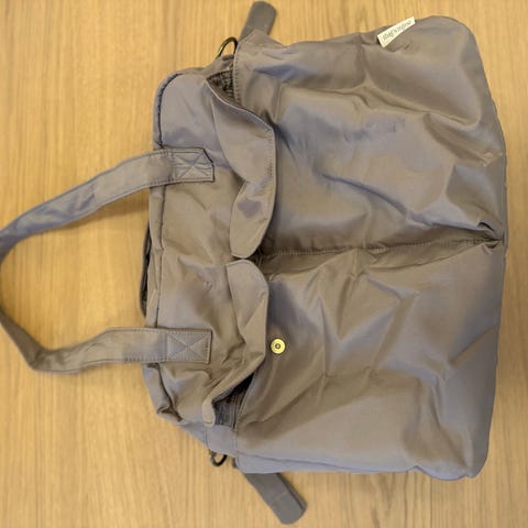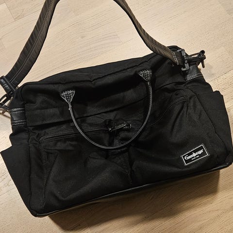 Emmaljunga skötväska i beige färg med quiltad design. Väskan har flera fack och blixtlås för förvaring av blöjor, kläder och andra babyartiklar. Passar för användning med Emmaljunga barnvagnar.