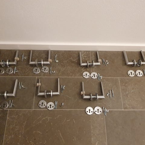 Sats med mässingshandtag och nyckelskyltar. Innehåller fyra handtag, fyra nyckelskyltar och tillhörande skruvar. Passar för dörrar med nyckelöppning. Material i mässing, färg guldfärgad.