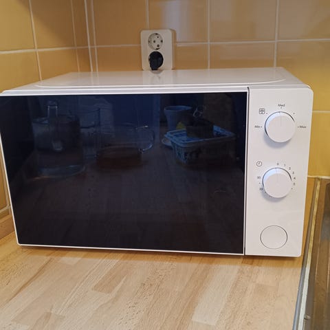 Senz mikrovågsugn i vit färg. Utrustad med mekaniska vred för inställning av effekt och tid. Inre utrymme med roterande tallrik för jämn uppvärmning.