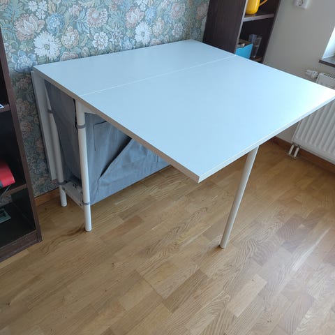 Pågrund av flytt säljer jag nu mitt fina matbord. Det är ett mörkbrunt bord i trä med klaffar på båda sidorna, perfekt för en liten lägenhet! Det får plats 4 stolar när båda klaffarna är uppfällda. Köpt second hand så vet tyvärr inte märket, men säljer billigt då det har lite slitage. Bordet har en diameter på ca 90cm ( med en bredd på ca 55cm när båda klaffarna är nedfällda).