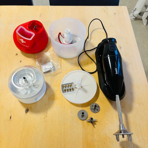 Bamix, köksmaskinstillbehör med olika delar för matberedning. Innehåller rivjärn, skivare, blandare och andra tillbehör. Det går inte att skicka, såvida köparen har och kan skicka emballage.