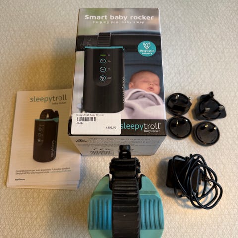 Baby Rocker från Sleepytroll. Inköpt februari 2025 och använd till ett barn. Funkar felfritt. Lampan lyser inte när man laddar men laddningen fungerar som den ska. Adapter till spjälsäng ingår. Nypris för båda totalt ca 1700.
