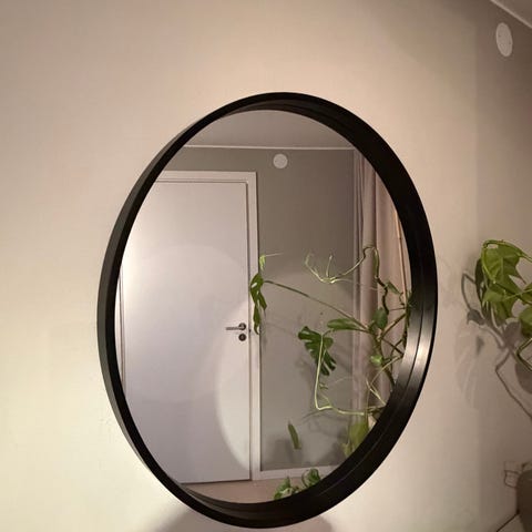 Jätte fin Svart rund spegel med ram i metall och rep hängare för upphängning. Spegeln har en enkel design med en svart ram och ett rep som används för att hänga upp spegeln på väggen.