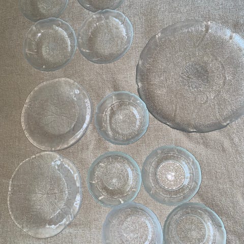 Arcchio glas skålar och tallrikar i olika storlekar. Setet består av transparenta glasföremål med strukturerad yta, lämpliga för servering och dekoration.