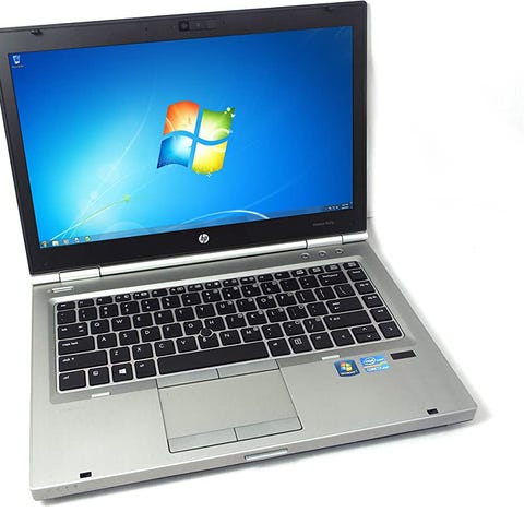 HP Laptop med standardstorlek och vit tangentbord. Enheten har en skada på hörnet av chassit, vilket kan påverka utseendet. Skärmen visar en webbläsare med Google som startsida. Specifika tekniska detaljer är inte tillgängliga.