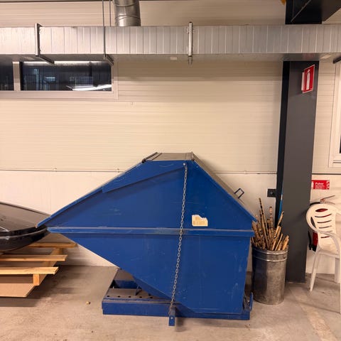 Tippcontainer utrustad med en fjäderbelastad tryckplatta på underredet för automatisk tippning och tömning, återgång och låsning.