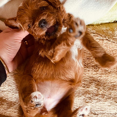 Pappa: Våran egen dvärgpudelhane, gårdens clown, full av glädje och bus,älskar bollar och att sitta i knät för klapp! 🐾💞