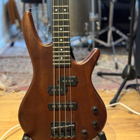 Elbas med svart kropp och vit pickguard. Utrustad med fyra strängar och en hals i träfärg. Inkluderar en axelrem med rosa och svart mönster. Passar för spelning i olika musikstilar och miljöer. Kommer även med förstärkare.