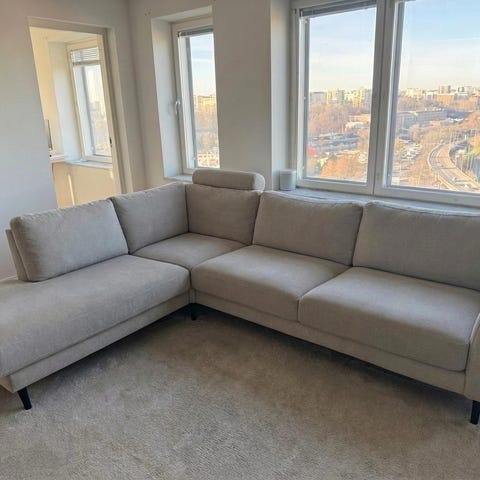 Säljer nu vår stilrena och populära Bridge-soffa från Mio. Det är en 3-sitsmodell med schäslong.