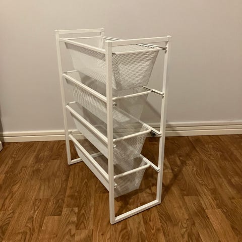 IKEA förvaringshylla med fyra nätkorgar i vitt. Passar för organisering och förvaring av olika föremål i hemmet.
