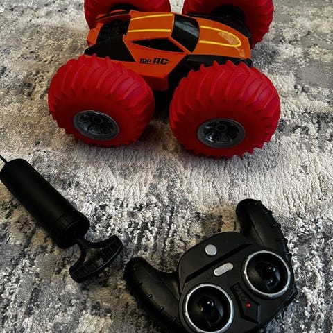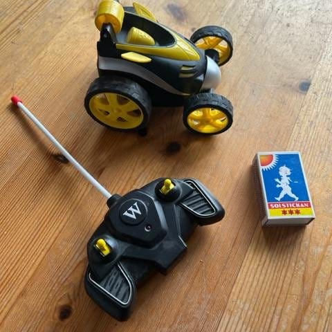 Barnracerbil i rosa med metallratt och säte. Utrustad med fyra hjul och emblem med "nummer 1" på sidorna. Passar för små barn att sitta och köra på, har använts nästan bara inomhus.