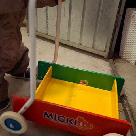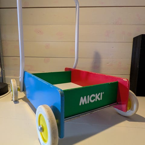 Micki lära gå-vagn i bra skick, ljusgrå färg. Tillverkad i trä och avsedd för barn att använda när de lär sej gå men funkar oxå vid lek och transport av leksaker.
