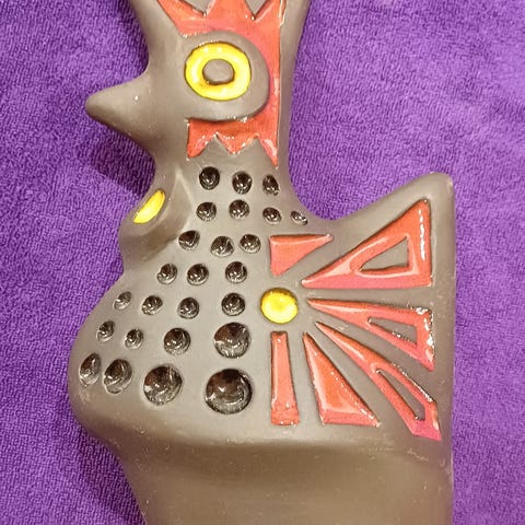 Stor vas i form av en tupp i brun keramik med vit glasyr detaljer. Höjd 24 cm, längd 15 cm och bredd 7 cm. Det finns en stämpel som jag ej kan utläsa under. Felfritt skick.
