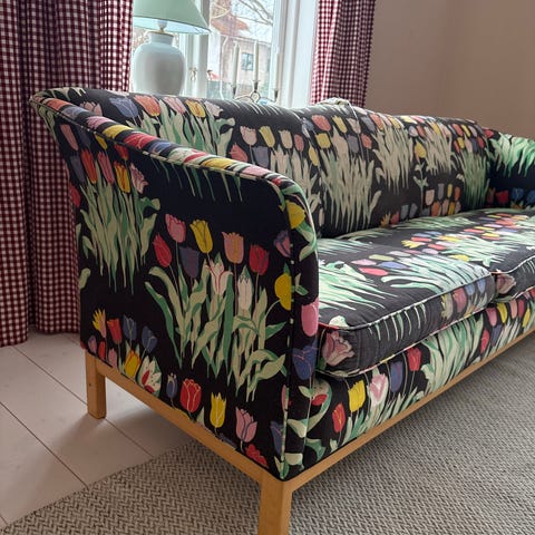 Denna fåtölj har tyget Mönster, FärgMöbellin, Bärnsten och är original . Tyget är i mycket fint skick på fåtöljen . Endast lite mindre märken på stommen (träet) finns i övrigt i toppskick .