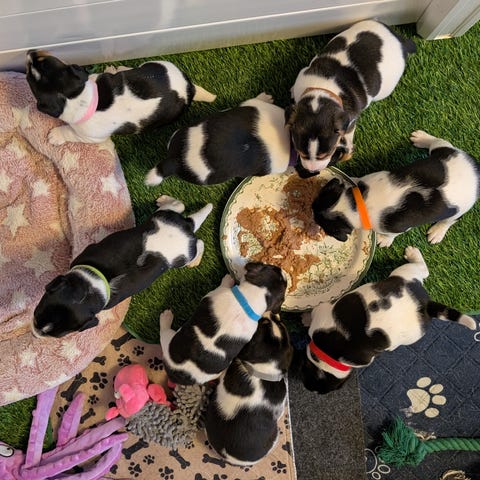Medföljer ett valpkitt för den första tiden i det nya hemmet med bland annat halsband, koppel, foder, leksaker osv.
