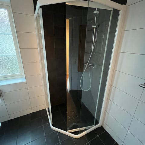 Duschhörna med glasvägg. Duschhörnan har en glasdörr med kromade beslag. Duschhörnan är 70x90 cm med yttermått på 73x93cm