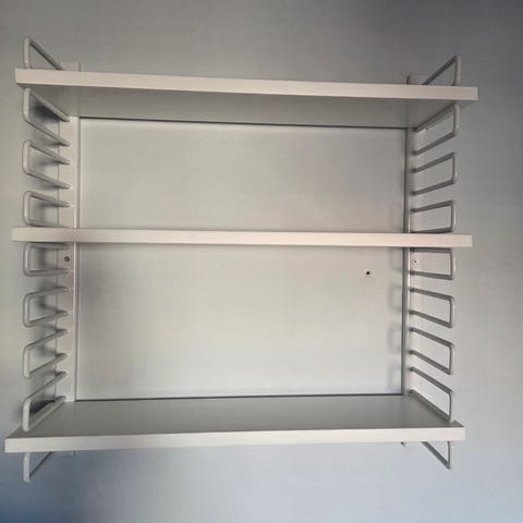 STEDGE vägghylla 80 cm, svartmålad ek. Säljs exakt som på bild (4 hyllplan). Mindre skada på ett plan, se bild. Kvitto finns. Nypris: ca 9500:-, kan tänka mig släppa lite billigare vid snabb affär.