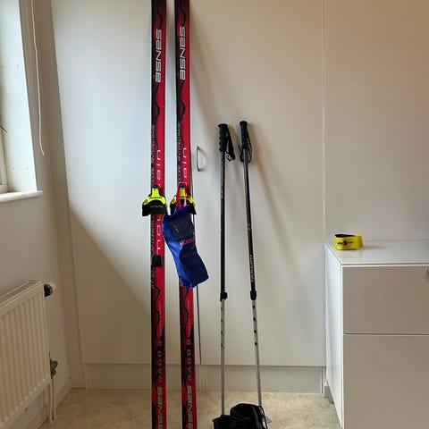 Fischer Box Crown E99 turskidor med stålkant och fiskfjällsmönster under fotsteget. De är 203 cm långa och pjäxorna är Alpina storlek 41