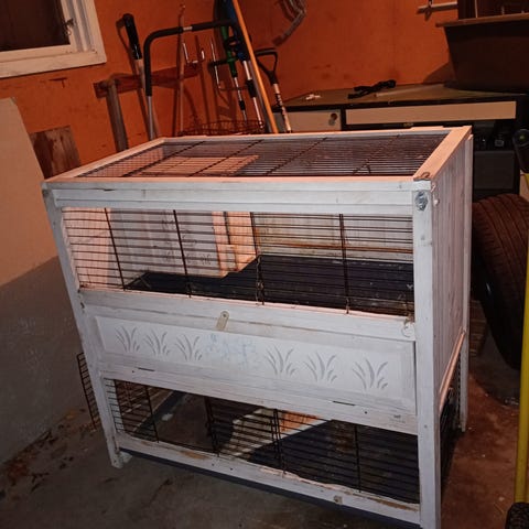 Kaninbur med plastbotten och metallgaller. Mått cirka 60 cm i längd och 40 cm i bredd. Färg blå och vit. Passar för små husdjur som kaniner eller marsvin.