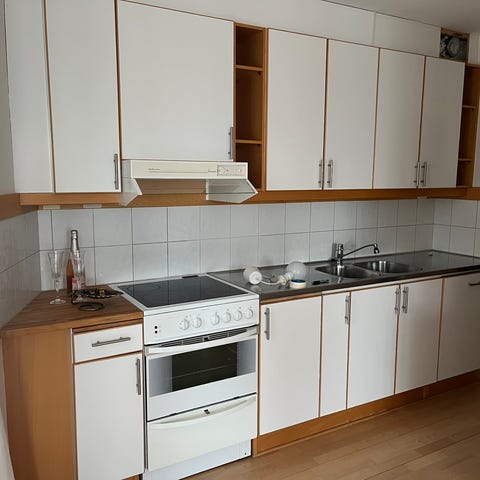Köksinredning i trä med flera skåp, lådor.ej bänkskiva. Inkluderar inbyggd ugn, mikrovågsugn kyl och frys. Vitvaror gamla Miele, men fungerande.