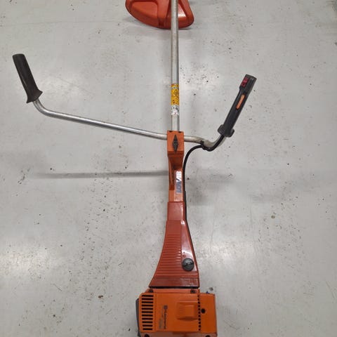 Stihl FS 460 C-L röjsåg med tvåtaktsmotor och cykelhandtag. Utrustad med trådskärning för gräs och mindre buskage. Lämplig för trädgårds- och markarbete.