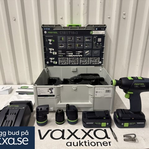 Festool T18+3 är byggd för att möta behoven hos professionella användare inom möbelmontering, snickeri, industriella applikationer och mycket mer. Den levereras med ett komplett set av tillbehör, inklusive två kraftfulla 18V-batterier, laddare och olika chuckar, allt förpackat i en praktisk Systainer för enkel transport och förvaring.
