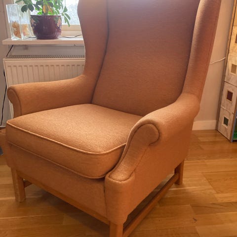 En trivsam och ovanlig fransk Bergère fåtölj i Directoire stil, den har Gustavianska influenser och är tillverkad någon gång på 1900-talets första hälft (uppskattat), tyget är helt med trevlig färg men man skulle kunna klä om med ex Svenskt Tenn eller något annat Josef Frank inspirerat för mer uttryck.