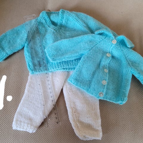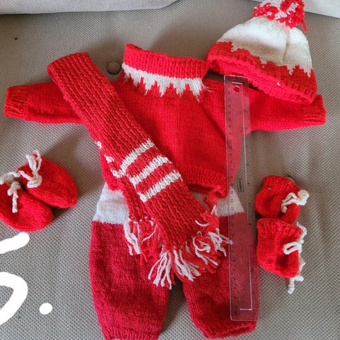 Hon är 89 år och stickar i princip varje dag. 🧶 Dock är hennes alster ganska nischade, till Skrållan-dockan. Se linjalen på bilden.