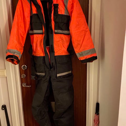 Arbetsdräkt i grå och svart färg med långa ärmar och ben. Dräkten har förstärkningar på knäna och reflexdetaljer på armar och ben. Passar för arbete där skydd och synlighet är viktigt.