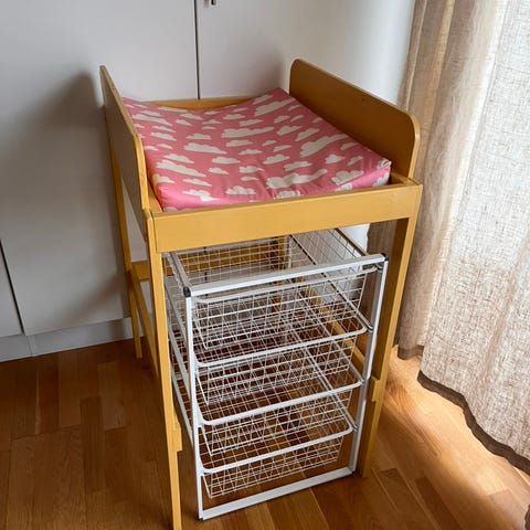 Bra skötbord från Ikea med två överdrag. Du kan få en praktisk blöjhink på köpet.