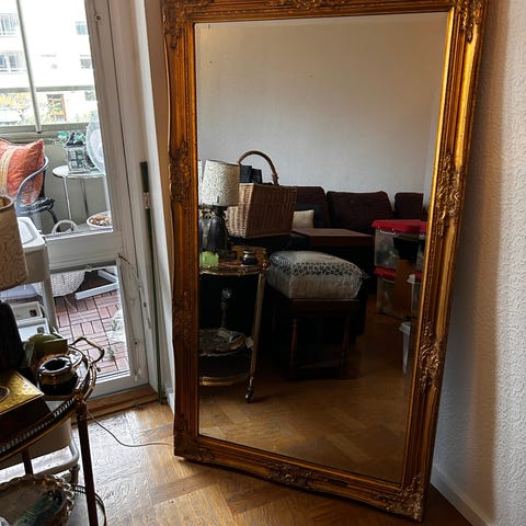 spegel med dekorativ ram. Spegeln har en detaljerad och ornamenterad ram som ger ett klassiskt utseende. Passar för användning i olika rum för att förstora och ljusa upp ytor.