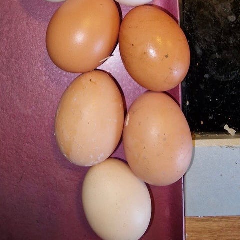 Ägg med blandade färger inklusive bruna, beige och vita. Äggen är från olika stora raser: RIR, Orpington, Skånsk Blomme, Appenzeller,Vorwerk, New Hampshire, Maran, Isbar mm