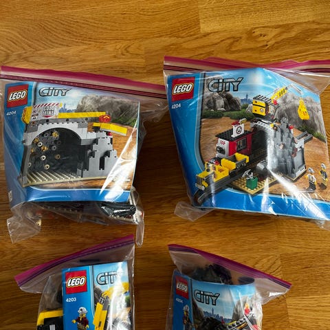LEGO City gruvset med olika byggdelar inklusive en lastbil och utrustning för gruvverksamhet. Setet innehåller flera komponenter som kan användas för att bygga en gruvmiljö med tillhörande fordon och maskiner.