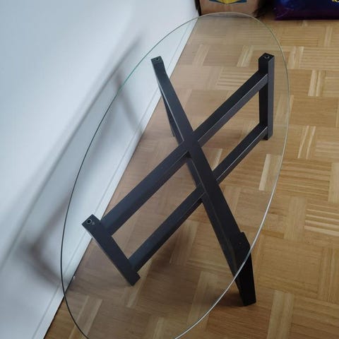 Glasbord med svart glasskiva och grått underrede. Bordet har en modern design med en kombination av glas och metallmaterial. Passar för användning som soffbord eller sidobord i vardagsrum eller kontorsmiljö.