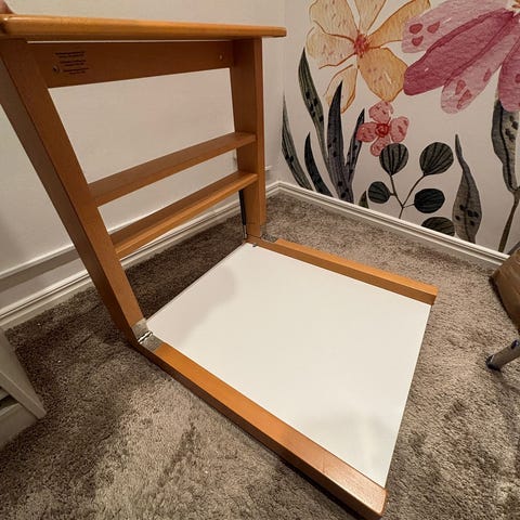 Praktiskt skötbord som placeras ovanpå en vanlig tvättmaskin, perfekt för mindre badrum. Tillverkat i trä och målat vitt. Stabil konstruktion med höga kanter för extra säkerhet samt sidofack för blöjor och tillbehör.