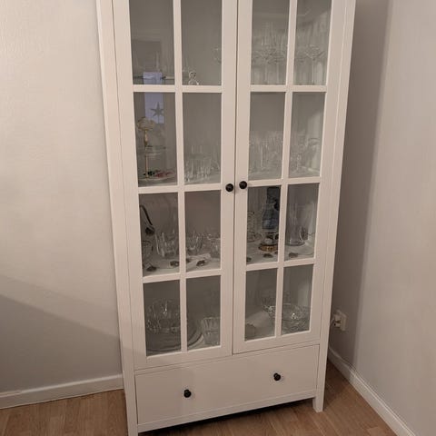 Vit stomme med glasdörr med ram i björkfanér, 9 st hyllplan i glas som kan sättas på olika höjder. Utmärkt för t.ex. cd-förvaring eller glas och annat.