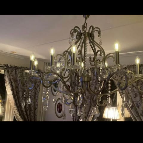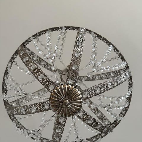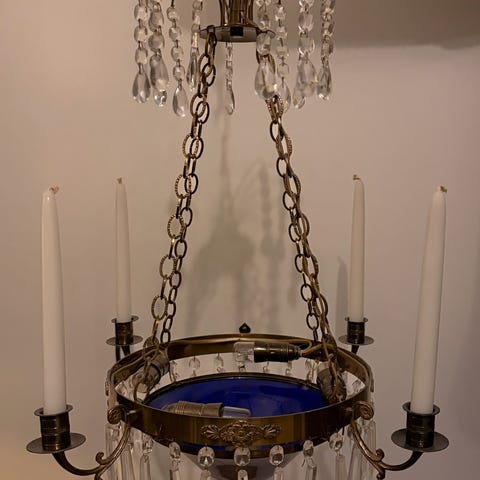Mycket fin och elegant takkrona med kupa i blått säljes. Både elektrisk och för levande ljus. Höjd ca 70 cm. Pris 3500 kr. Har även passande bordslystrar till salu, se bild.