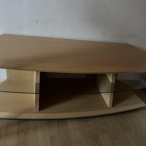 TV-bänk med glashyllor inramade i teak. Kan även användas som en vanlig hylla. Mycket god kvalité. Längd: 125 cm, djup: 40 cm, höjd 65-70 cm